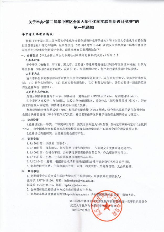 2.6月10日前:报名确认、提交作品(报告和视频),作品提交要求详见附件2《第二届华中赛区全国大学生化学创新实验竞赛(第一轮通知盖章扫描版)》