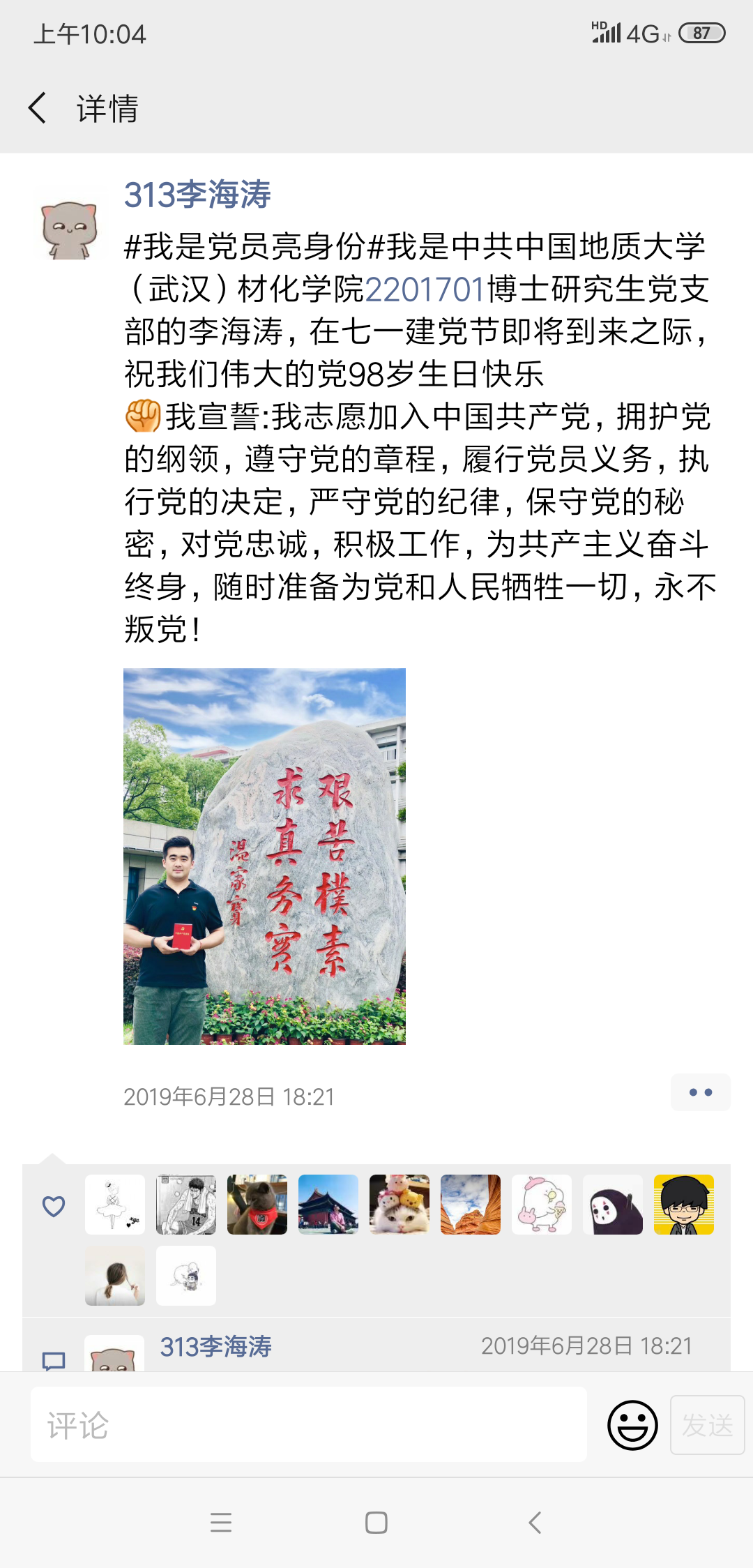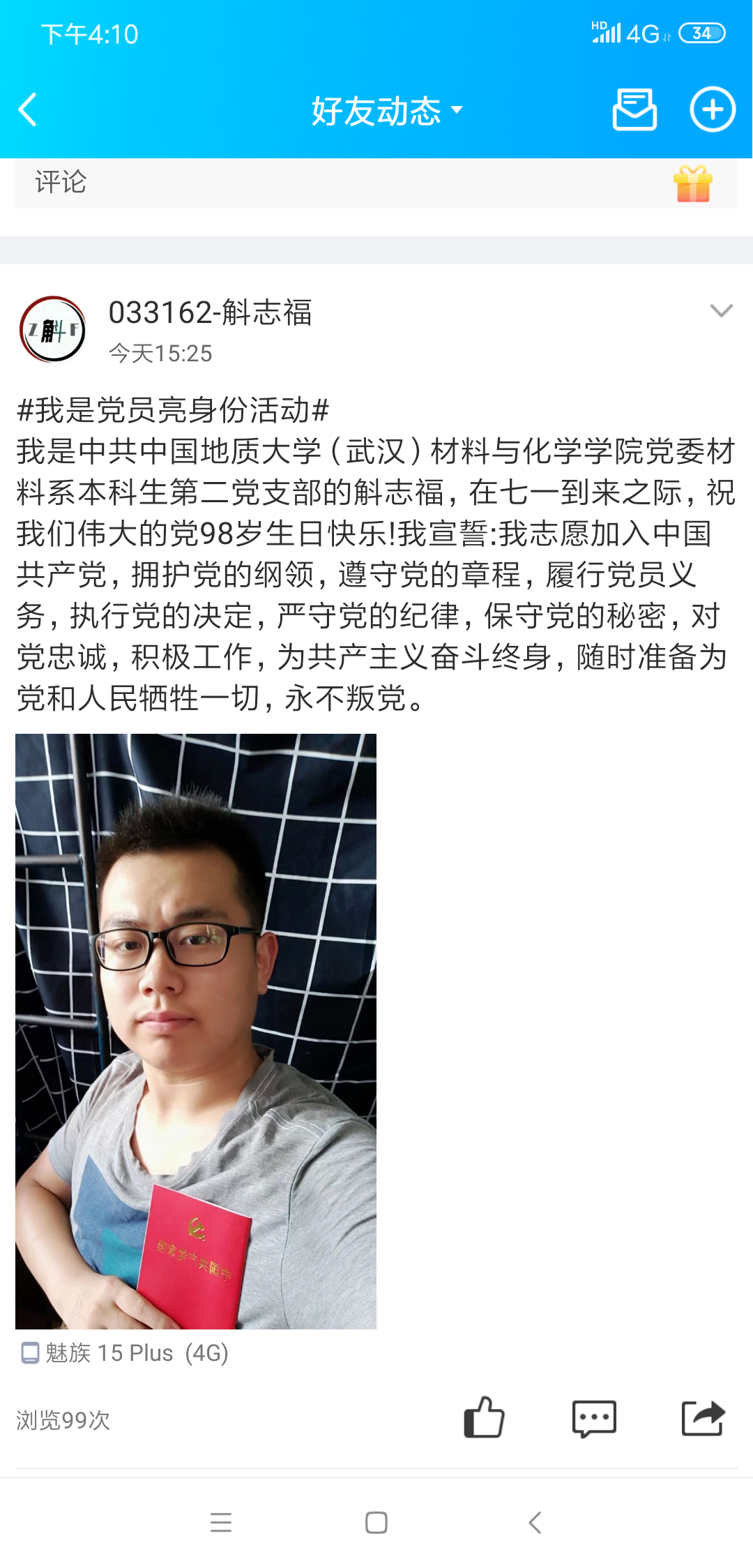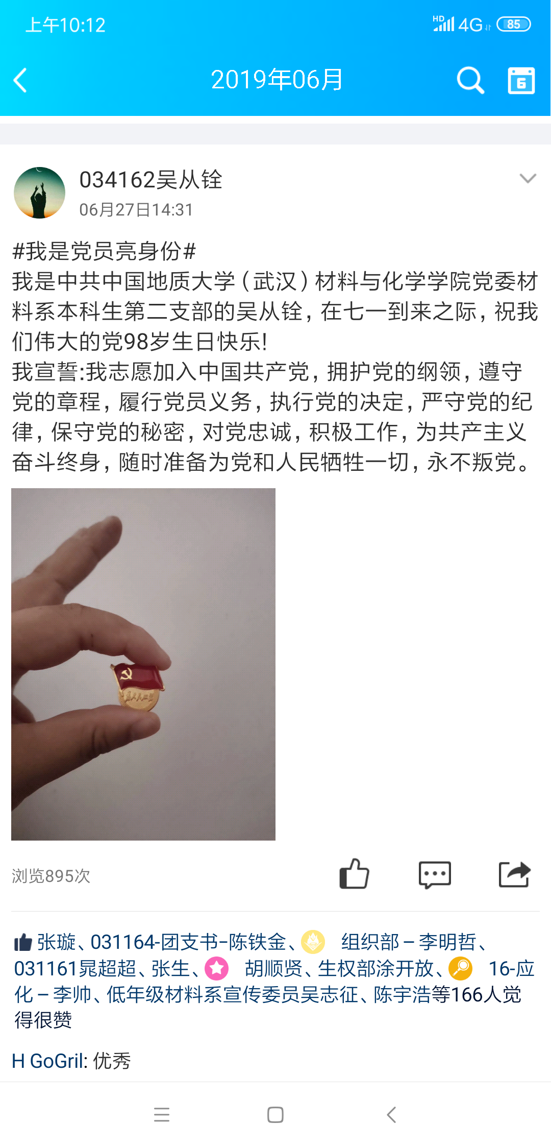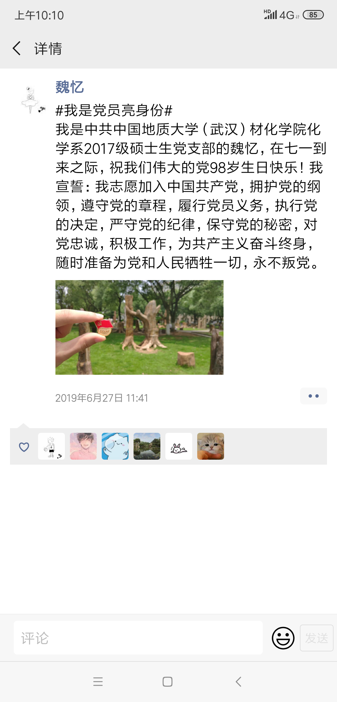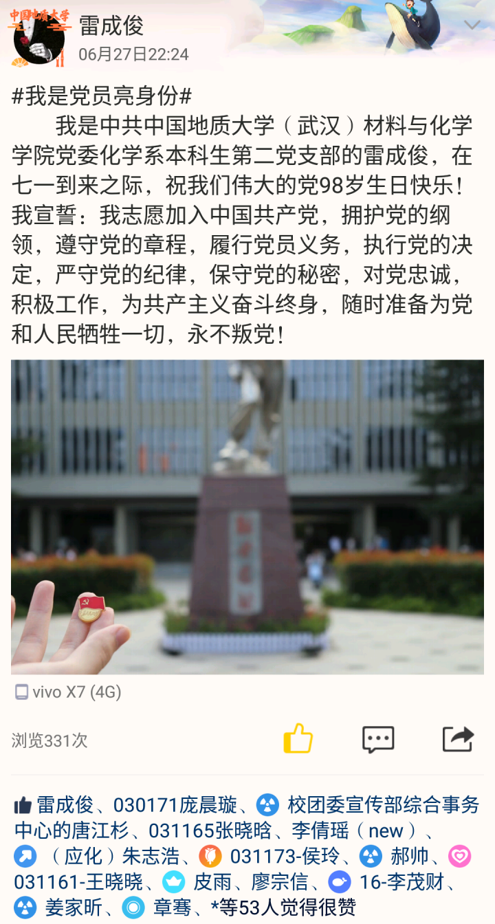 原来,这是材化学院党委在“七一”到来之际组织开展的“我是党员亮身份”的线上活动。来自11个学生党支部的近百位党员参与其中,为党的生日送上最好的礼物。党章、党徽、党员手册都成了大家晒图的标配,有的学生党员以校门口、化石林、图书馆这些具有学校特色的景观为背景,有的学生党员还露脸出镜,脸上写满了作为一名共产党员的骄傲自豪。党员们“亮身份”的举动引来了广大同学的关注,同学们纷纷在下面留言,表达“党员同志优秀”的赞美,表达“无比羡慕”的心情。