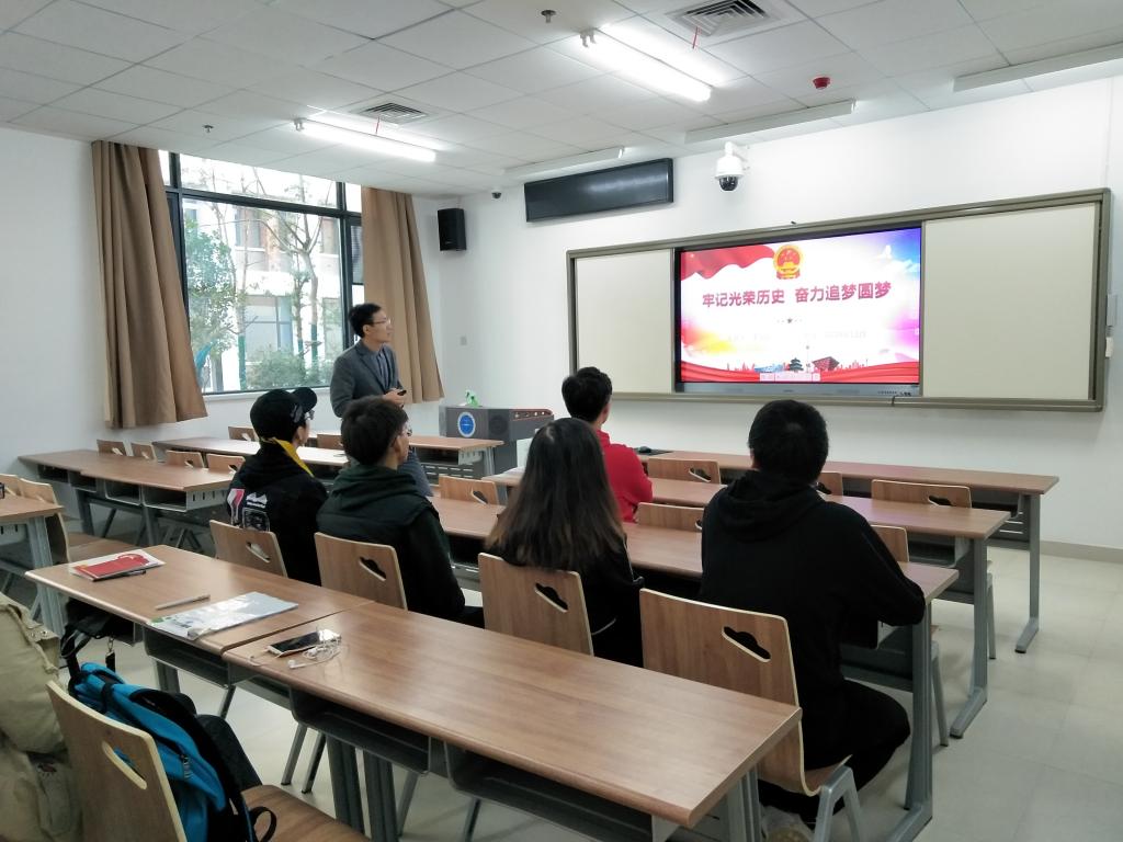 “中国梦是中国人民共同的思想追求和目标,是中华民族近代以来最伟大的梦想,在不同的时代有着不同的体现,从反抗外来侵略者的站起来,再到现在的富起来,中国共产党一直带领着广大人民不断探索,谋求发展,直到中华民族强起来。”副院长李国岗从中国梦切入主题,他以手机的更新换代为例向同学们展示了技术的进步及国家的发展。