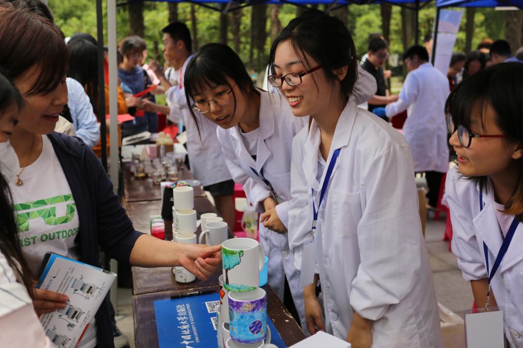 在“感温幻彩魔杯”的展演中,只见展演队员把热水倒进杯中,杯子外层的图案缓缓变换了颜色,将杯中换成冰水,图案又恢复了原来的颜色。展演队员鲍茜介绍,他们采用了一种微胶囊化的有机可逆感温变色材料,制备成涂料之后涂覆在马克杯上,当杯子里水的温度变化时,就会导致变色材料的物理化学结构发生变化,进而导致其光谱性质的转变,从而在宏观上体现出颜色的变化。