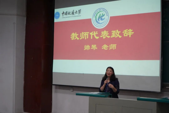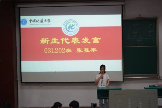 新生代表、材料二班张旻宇向同学们分享了个人的成长经历以及由单晶硅片所引发的与材料学科的缘分,表达出自己对材料专业的强烈热爱,并对美国打压华为事件、中国精密陶瓷的制造与材料化学之间的联系阐述了自己的见解:目前我国在材料方面的自主研发水平略有欠缺,这就需要每一位有志青年、每一位材化学子为之认真钻研、不懈奋斗。同时,张旻宇号召大家共同学习王焰新校长在校开学典礼上的寄语,与2020级新同学约定“趁年轻、下功夫、练内功、起好步,走好人生路”,最后宣誓道:今日你我在学校努力学习成长,明日用自己的才干为祖国添砖加瓦!