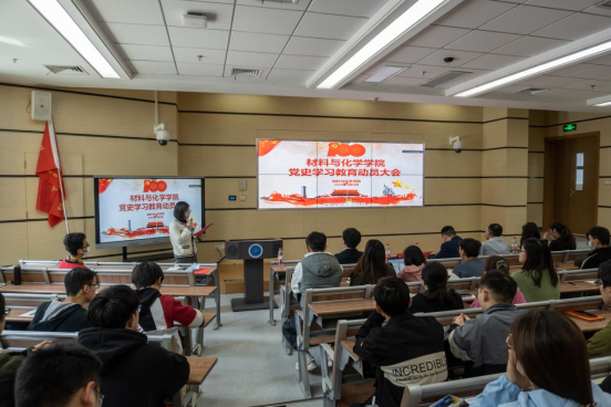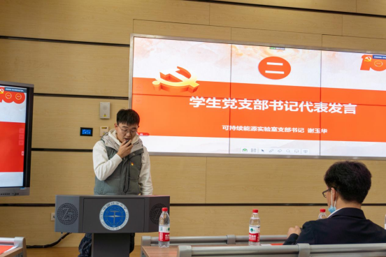 学院可持续能源实验室支部书记谢玉华作为学生党支部书记代表发言。他介绍了所负责的支部对党史学习教育活动安排,表示将通过专题学习、党史知识测试、参观红色景点、阅读红色书籍、观看红色影视剧等方式将党史学习“学在日常,学在实处”,切实达到教育实效。
