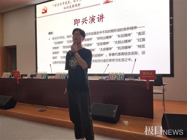 即兴演讲也是一中自我教育。各位选手围绕党的百年历史形成的精神谱系开展演讲。“红军不怕远征难……”抽到长征精神的同学语言铿锵,以诗言志,阐发对长征精神的看法。随后,红旗渠精神、航天精神、抗疫等精神内核不断被阐明。