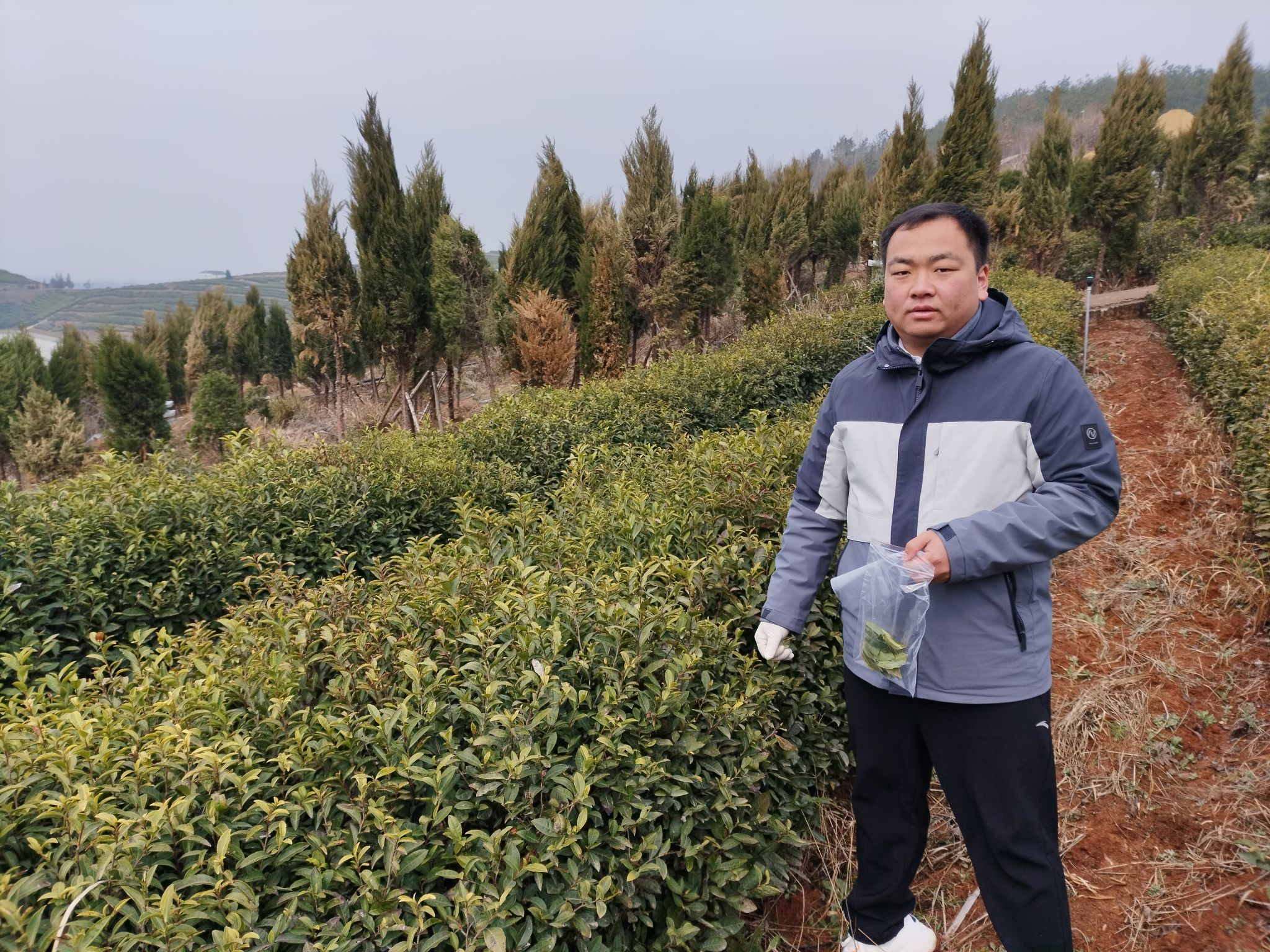 车华超在茶园采摘样品用于硒含量检测