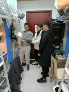 最后,学院领导和老师对各宿舍的安全卫生情况进行了检查,针对检查过程中发现的不规范行为进行了强调和纠正。同学们也表示将提高安全意识,与室友共同努力营造一个安全、文明、卫生的生活环境。在走访52栋306“百佳”寝室时,黄书记对该寝室的卫生环境进行了表扬,并邀请随行班长们进行参观,号召大家向他们学习。