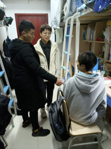 为及时了解学生返校情况和思想动态,保证同学们拥有良好的学习生活环境,2月20日七时许,我院党委书记黄菊和2021级辅导员李双越、2019级辅导员黄玲以及班级主要干部一同走访了学生宿舍,探望慰问返校学生,南望山校区与未来城校区同时进行。走访过程中,学院领导和老师与学生们亲切交流,询问他们开学后的感受,强调疫情防控相关要求,并对学生们在生活中存在的疑虑和问题进行解答。同时黄书记对同学们新学期的学习生活提出相关建议,希望大家在新学期养成良好的生活作息,保持积极向上的学习状态,提醒同学们在学习与生活中遇到任何困难问题都要及时与老师沟通交流,鼓励同学之间要相互理解,相互包容,充实地度过新学期。
