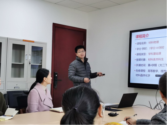 第一期教师工作坊的主题是第二届全国高校教师教学创新大赛的备赛。周炜老师代表《材料物理》课程组介绍了在去年参与首届大赛的备赛经验,他在工作坊中和各位青年教师分享了《材料物理》课程教学中存在的问题,以及创新改革的内容、措施和所取得的成效。