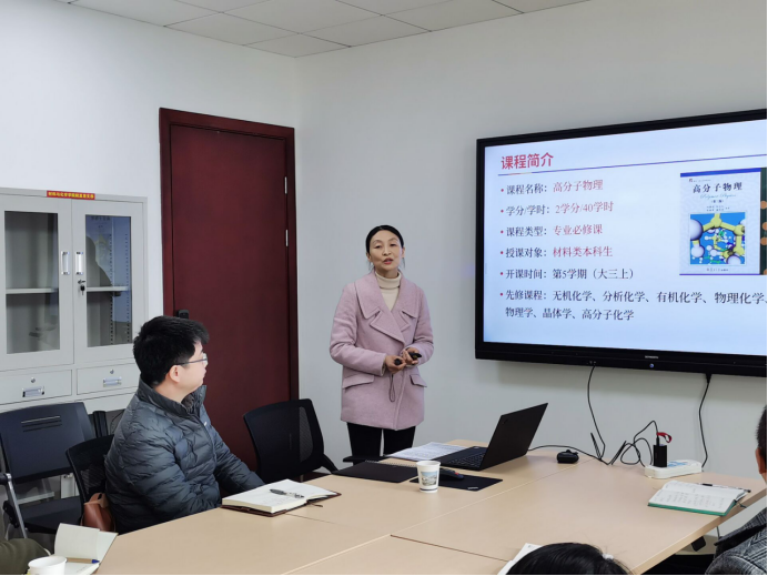 马睿老师今年代表《高分子物理》课题组参加今年的全国高校教师教学创新大赛,她分享了课程组在课程教学创新改革举措。由于我校材料化学、材料科学与工程专业的学生, 此前没有学过“统计热力学”等前期课程,因此与其他理科院校学生对于学习内容和要求有不同的要求和评价体系。针对以上问题,课程组在课程教学中为学生量身定做了适合的课程矩阵和课程评价,加强启发式教学,同时积极利用课外学时,开展小组讨论,开展创新实验设计进行素质拓展,让学生在自主操作中反思总结,激发学习兴趣。