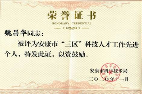 根据国家科技部等五部委《边远贫困地区、边疆民族地区和革命老区人才支持计划科技人员专项计划实施方案》以及陕西省科技厅等五部门《关于印发〈陕西省“三区”人才支持计划科技人员专项计划实施方案〉的通知》等文件精神,我院积极组织教师参与遴选省市“三区”科技人才计划工作,经过组织推荐、市县科技局等职能部门遴选、与受援单位签订“三方”协议等遴选程序,魏昌华成功入选安康市“三区”科技人才计划。