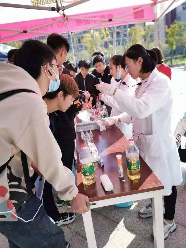 “大家仔细看,现在溶液是黄色的,震荡烧瓶,变红色;继续震荡,变绿色;静置10秒,变红色;再静置20秒,又变回红色”。“化学红绿灯”团队讲解员一边操作一边讲解,如同变魔术一般,一摇一晃之间,随意操控着这烧瓶世界里的色彩更替,宛如马路上的“红绿灯一般”。