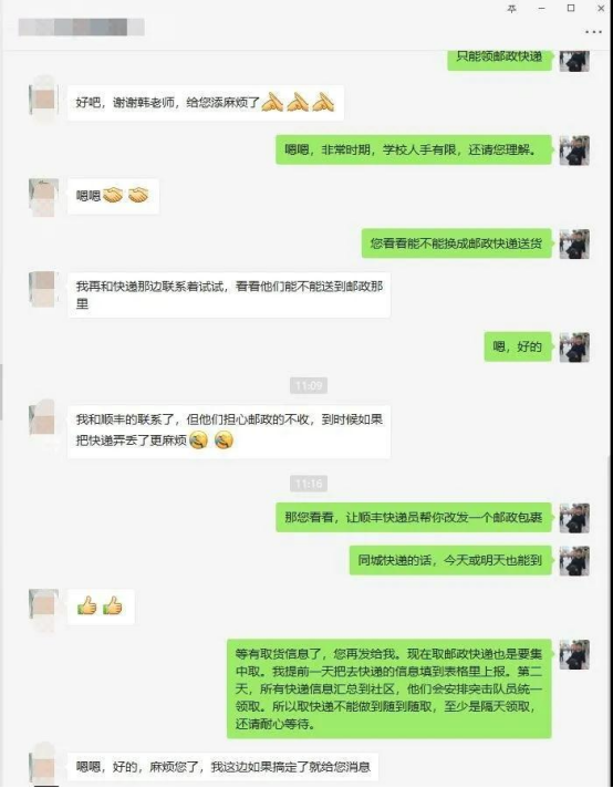 可偶尔还是会有一些突发情况。有一次,一名住户在网上购买了急需的药品,住户自己跑到大门口去取。但按照学校疫情期间的管理规定,快递不能进入学校。眼看着药品放在大门口却无法取回,这名住户心急如焚,于是他给韩波打电话。韩波接起电话,电话里住户情绪激动,劈头盖脸就是一顿质问,表示对学校的做法不能理解。“您先消消气,对快递的管控是学校从防疫全局考虑作出的安排,如果每个人还像平时那样去取快递,会大大增加感染的风险。这样吧,如果您相信我的话就把这件事交给我,我来想办法解决。”考虑到住户购买的是急需药品,韩波先联系社区的应急突击队,请求从中协调安排人员帮忙领取快递。当突击队员将药品送到住户家里时,他给韩波发了一条真诚的微信:“小韩老师,药品收到,感谢你的帮助。当时情急,一时口不择言,还请你见谅。”