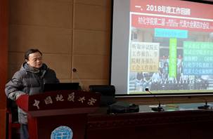 院办主任李晓晔作2018年学院财务收支情况报告,副院长周炜作教学工作报告,副院长李国岗作科研工作报告。