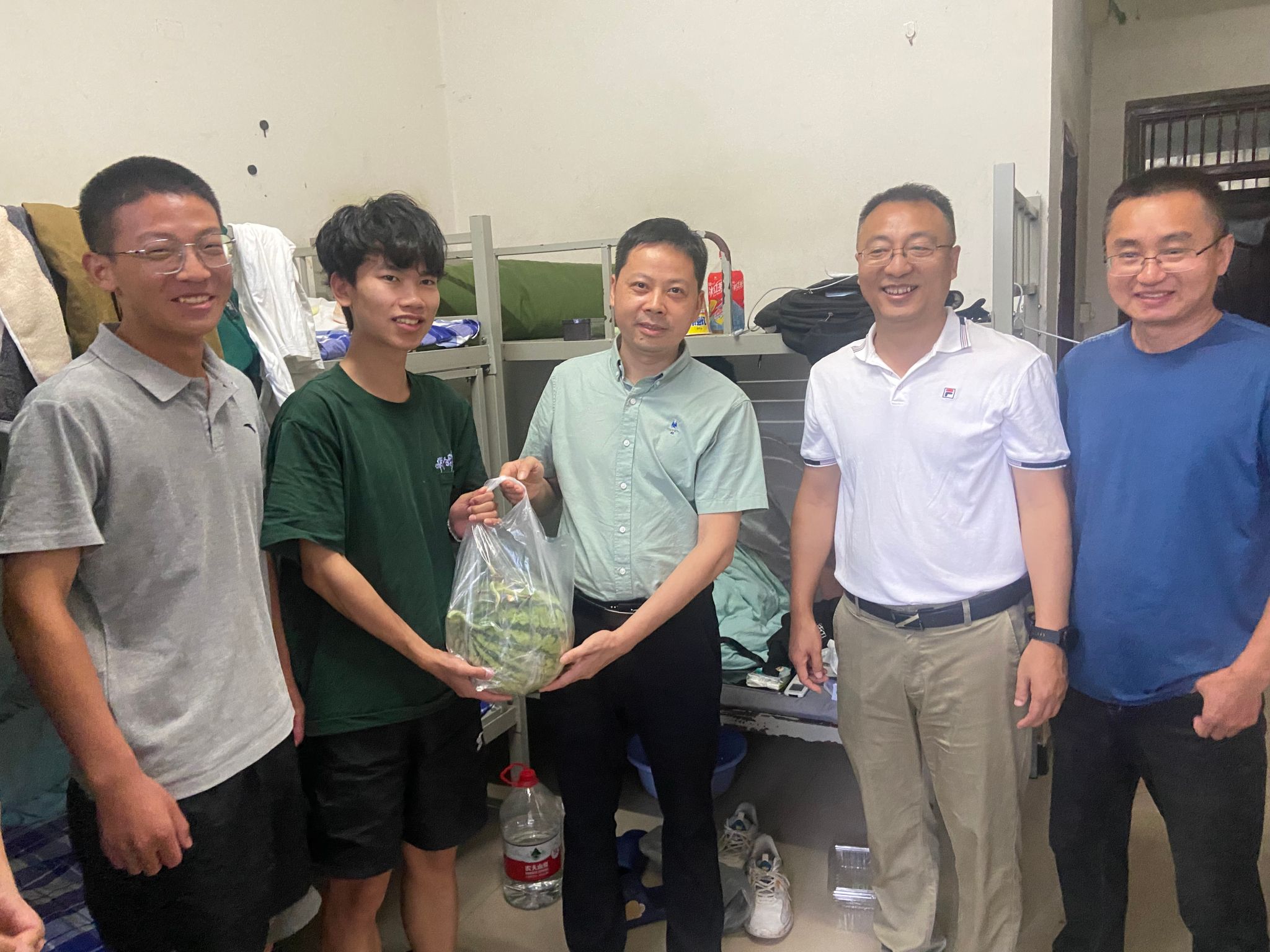 在实习学生宿舍,胡兆初、靳洪允仔细询问师生在基地生活、学习是否适应,听取他们关于实习内容、实习收获、面临困难等情况,并叮嘱大家在实习期间注意安全、保重身体,发扬艰苦朴素、求真务实的校训精神,不断增强专业能力。两位院长代表学院向同学们送上清凉解暑的西瓜大礼包。