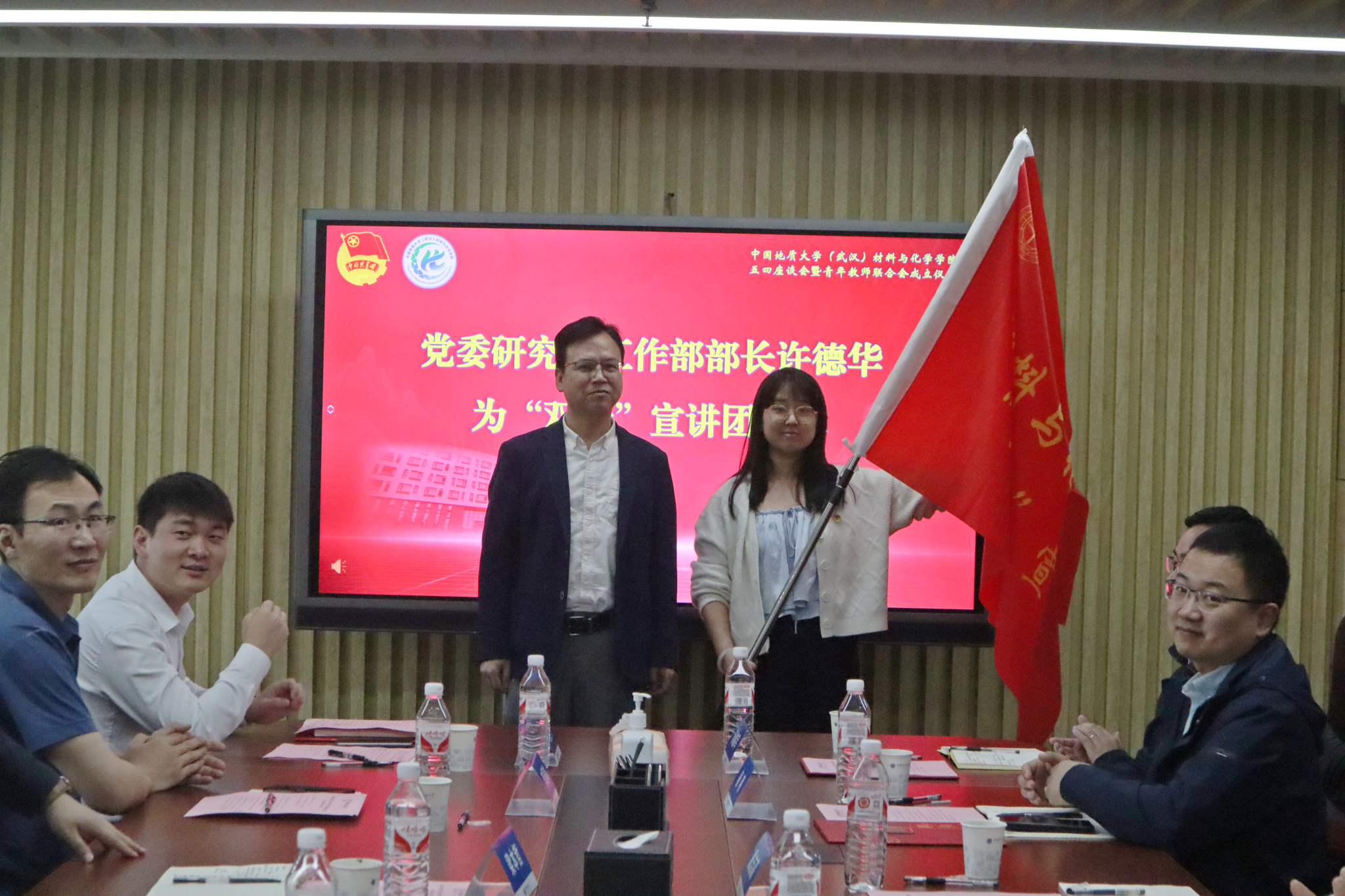 校党委研究生工作部部长许德华为“双新”宣讲团授旗,并讲话。他指出近年来williamhill英国中文在导学团队建设、学生工作上取得了长足进步,希望学院以青年教师联合会和“双新”宣讲团成立为契机,真抓实干,在培养时代新人上不断取得新发展新进步。